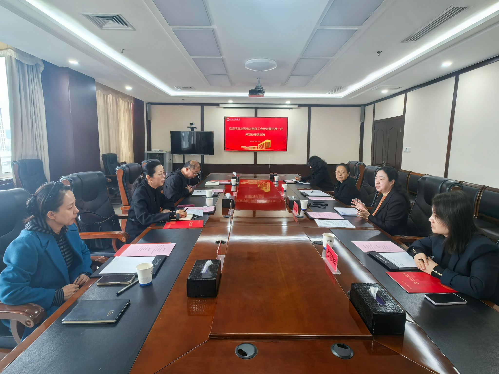 为学习借鉴兄弟院校工会工作的先进经验,进一步提升我校工会服务水平,2025年10月23日,河北水利电力学院工会常务副主席伊淑霞带队,工会副主席崔建军、工会办公室主任董晓、教师培训中心综合服务科科长赵六珍一行,前往河北金融学院开展工会工作调研交流活动。双方围绕职工之家建设、教代会制度建设、文体协会社团建设、女教职工和青年教职工工作开展情况、服务学校中心工作及青教赛组织等多个领域深入探讨,互学互鉴,取得了丰硕的交流成果。