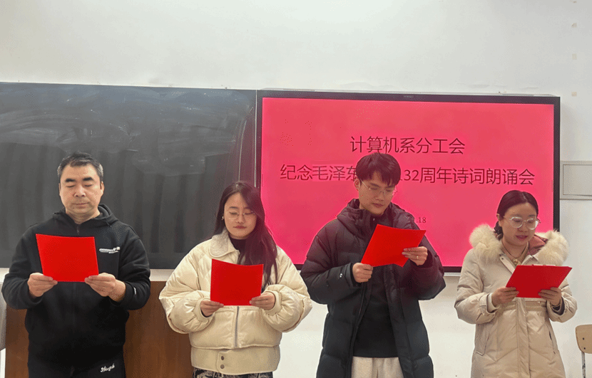 2025年12月19日下午,计算机系分工会举办了“纪念毛泽东同志诞辰132周年”经典著作及诗词朗诵活动。系党委书记崔炳德、党委副书记兼分工会主席曹志勇、系副主任冯涛和王建文及多名工会会员教师齐聚一堂,共同缅怀伟人、汲取精神力量。